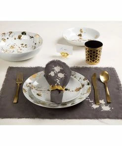 Dinner plates wow with a generous scale, friendly coupe shape, and all-over splatter pattern that reads like a sparkly neutral, while coordinating pieces are embellished with bold compositions. Formal enough for a fabulous fête, but hardworking for use as an everyday luxury.
