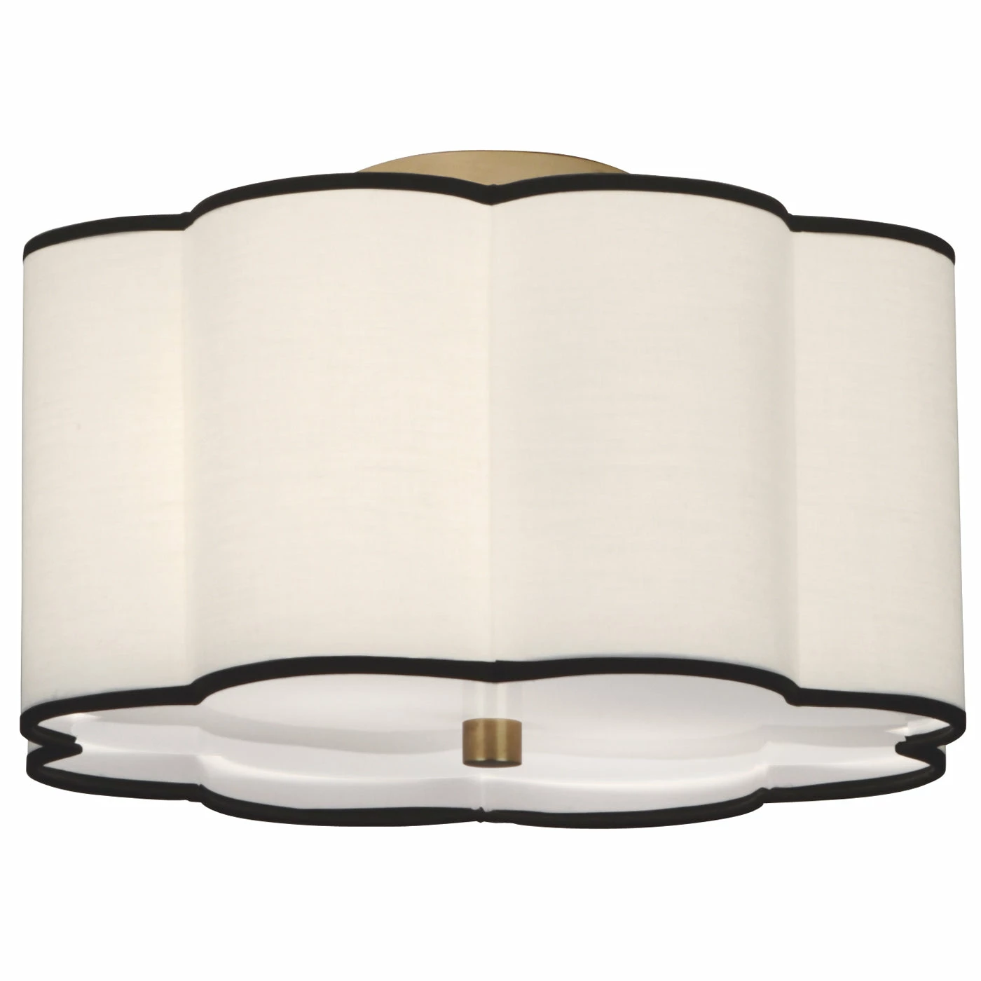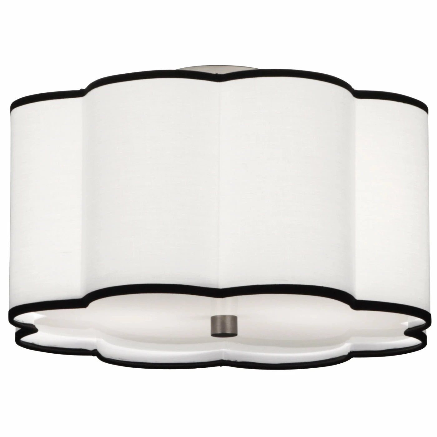 Our Axis Flush Mount is a polished mix of finishes and textures. The scalloped shade with contrasting trim adds a preppy vibe, and the feminine lines give it a French ’40s feel. An acrylic diffuser halts harsh glare.