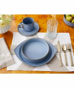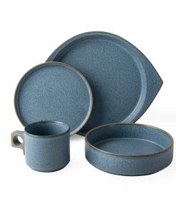 Four piece set includes one dinner plate, one salad plate, one soup bowl, and one mug.