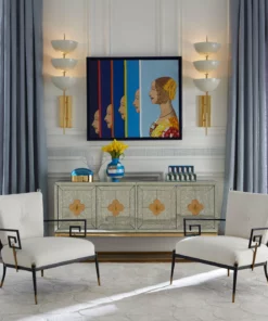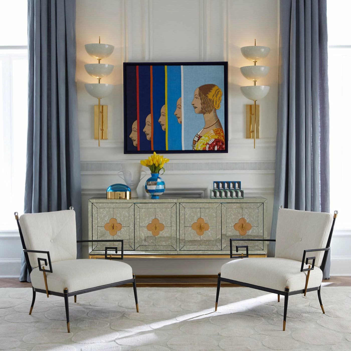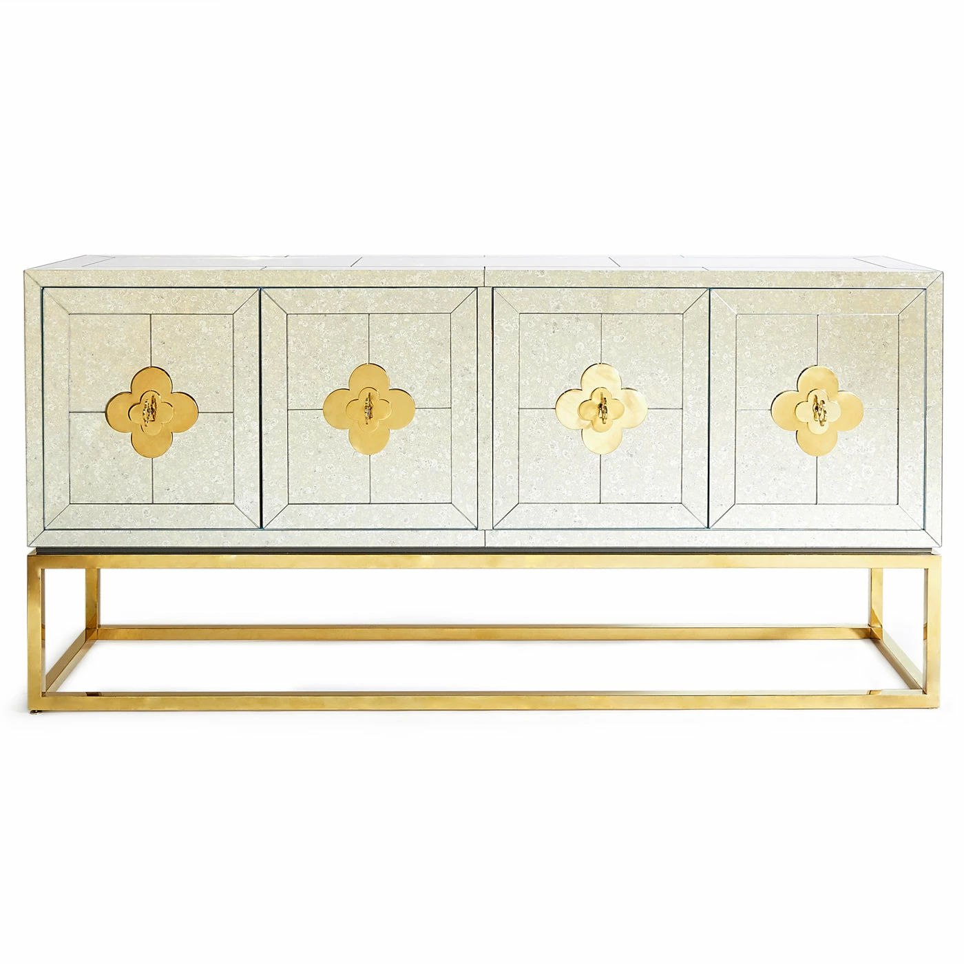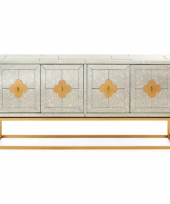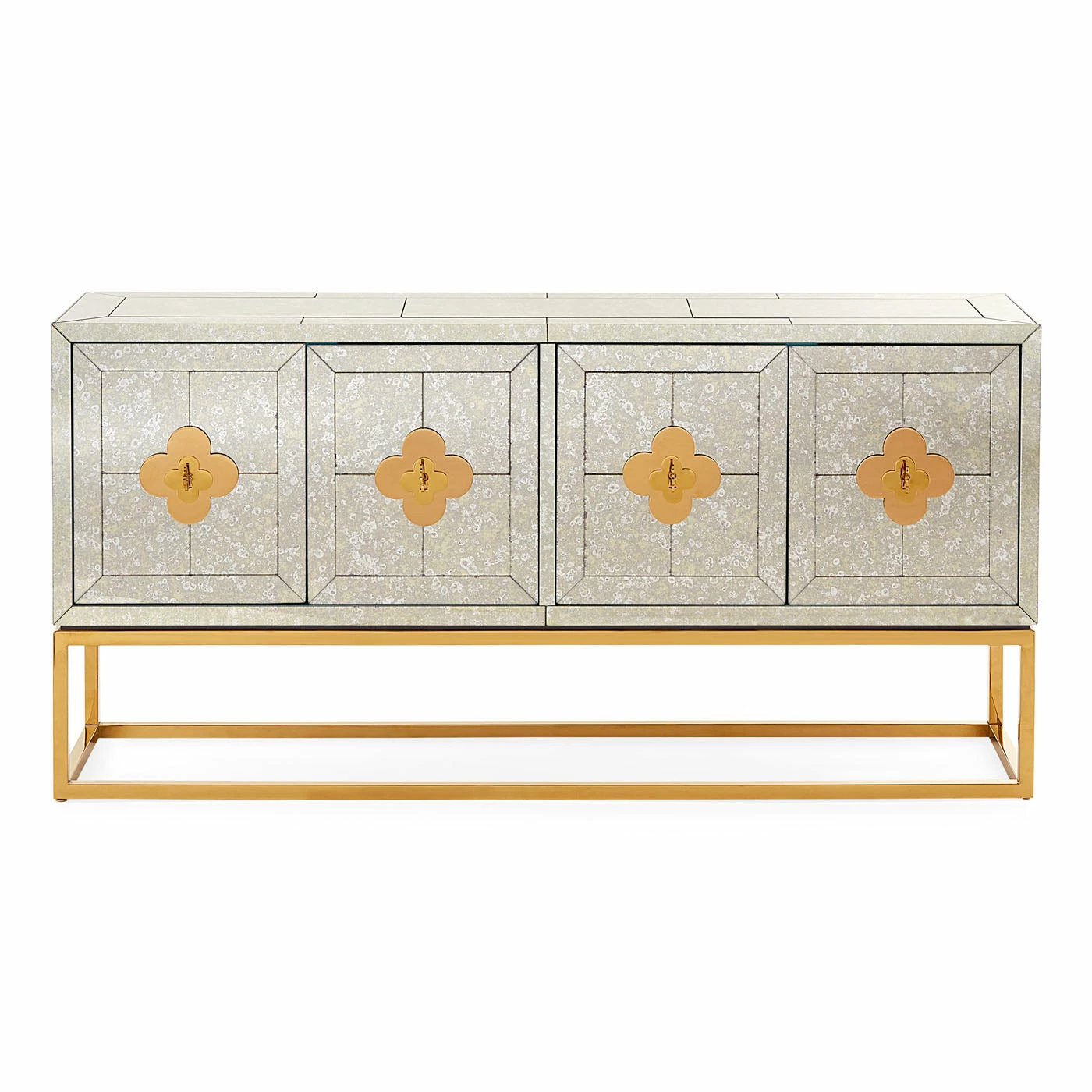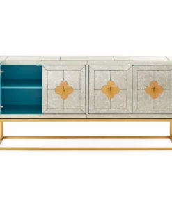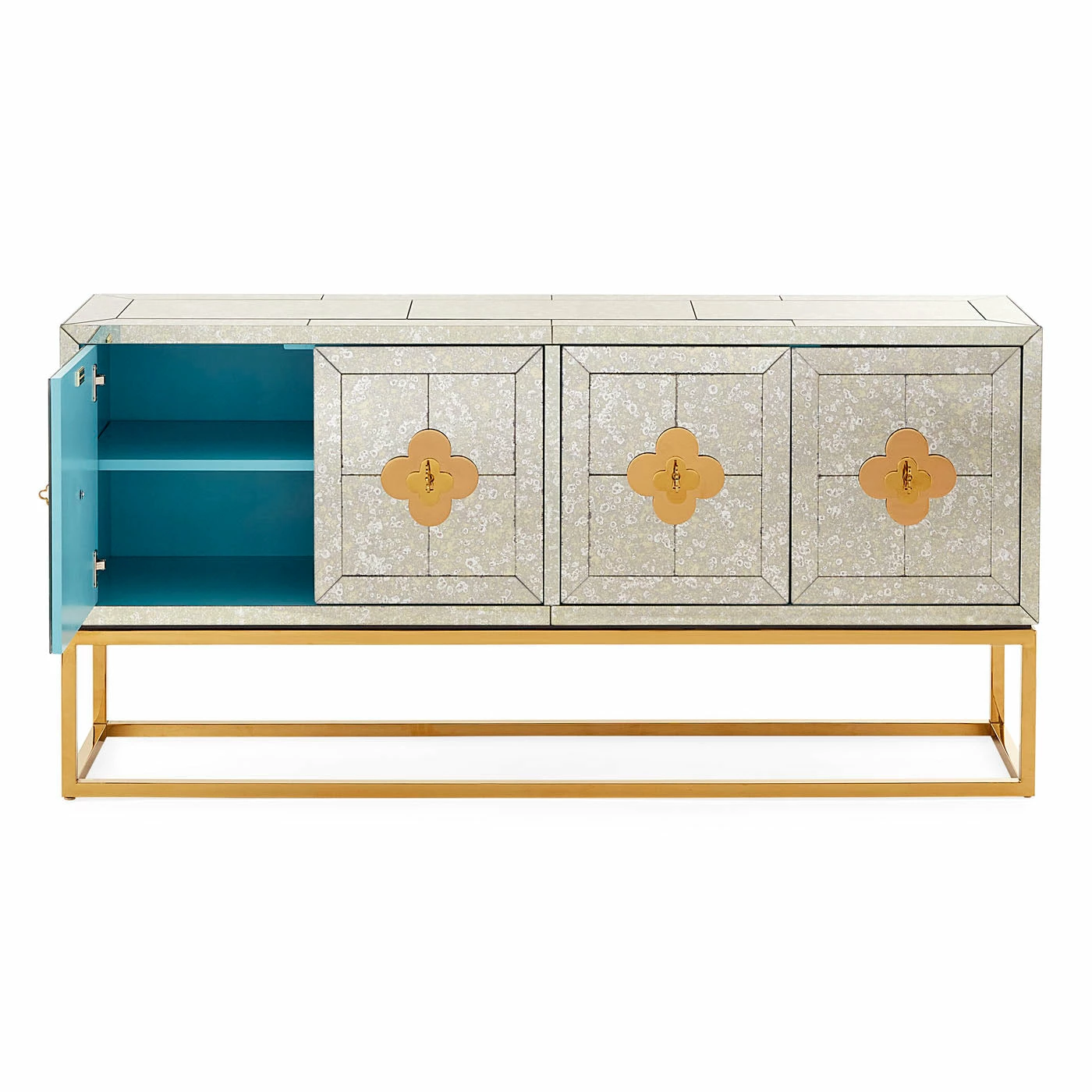 Minimalist forms meet Maximalist glamour. Antiqued mirror with a polished brass base. Two double-door compartments open to reveal a bright robin’s egg blue interior fitted with two adjustable shelves. Quatrefoil handles and escutcheons add a decorative flourish to the simple form.