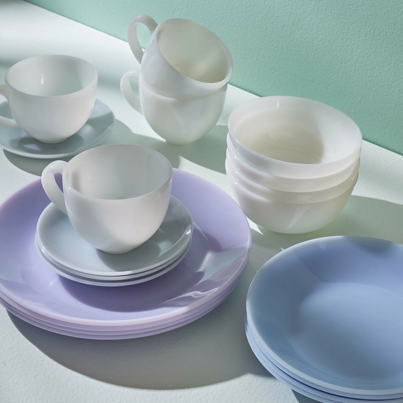 Go beyond porcelain and set a dreamy table with our surprising new collection of dishwasher-safe dinnerware made from opaline glass in heavenly hues of purple, blue, and ivory. Strong enough for everyday, but glamorous enough for a socialite soirée. Float. Float on…
