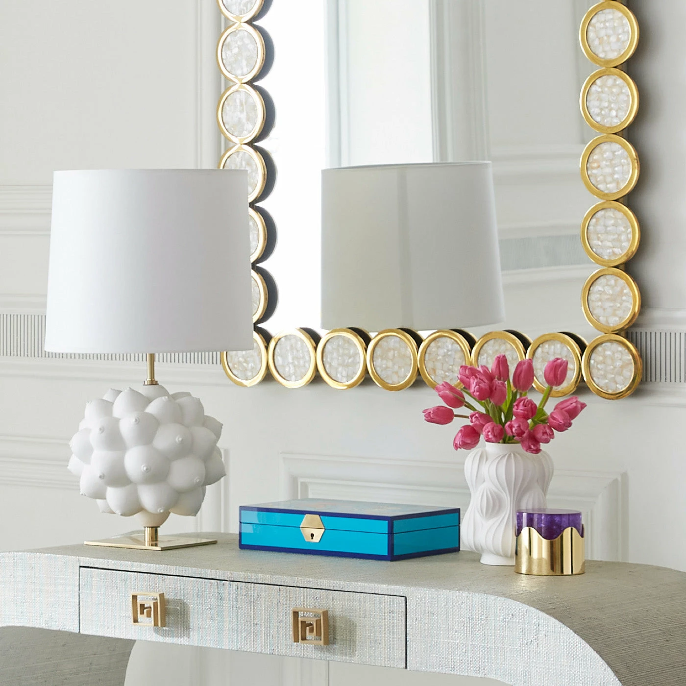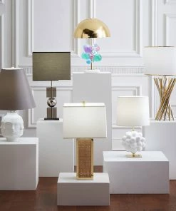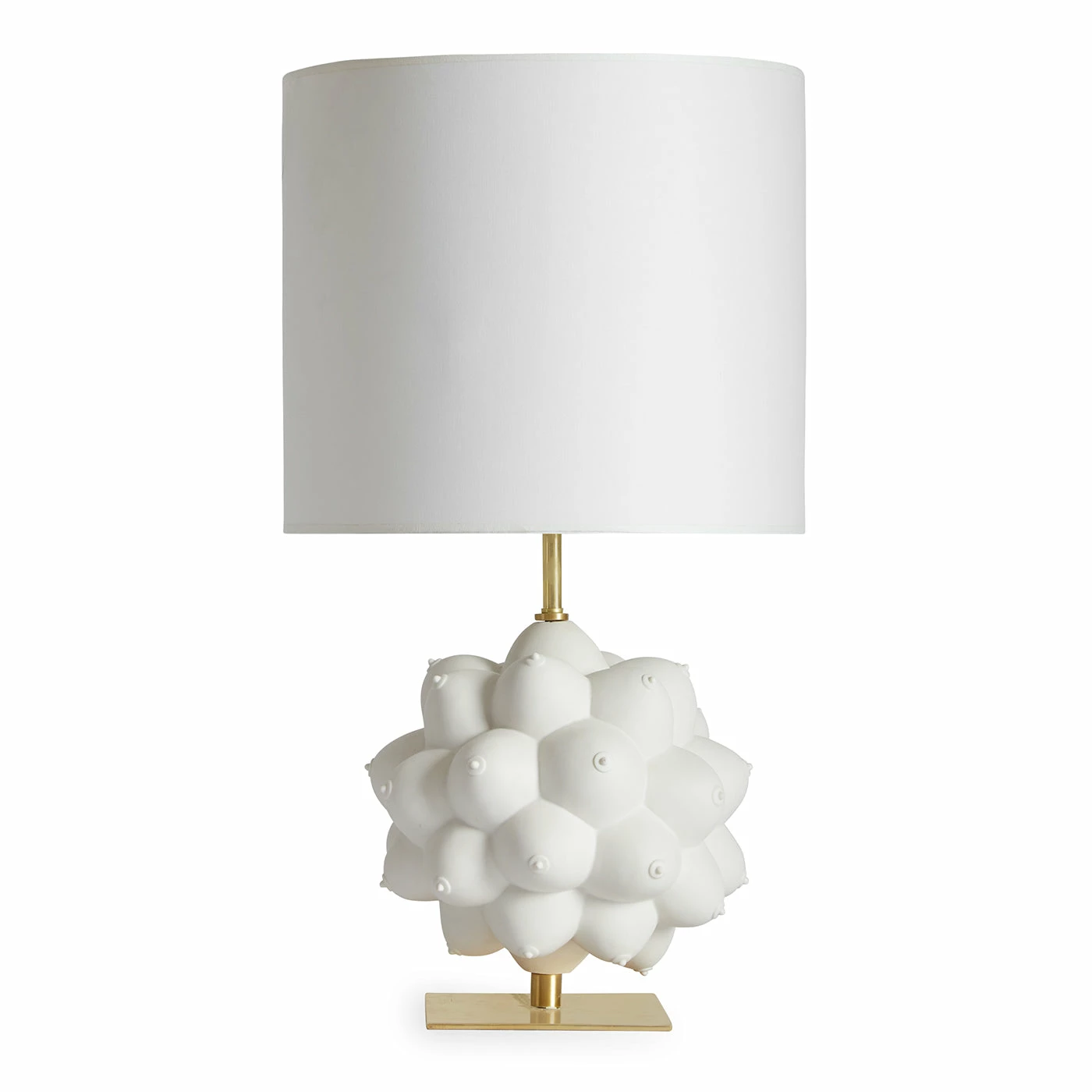 Our Georgia Table Lamp is a 360-degree celebration of provocation. An artful cluster of idealized form topped with a white paper shade, our eye-catching orb rests on a solid brass base.