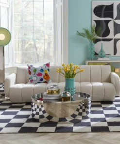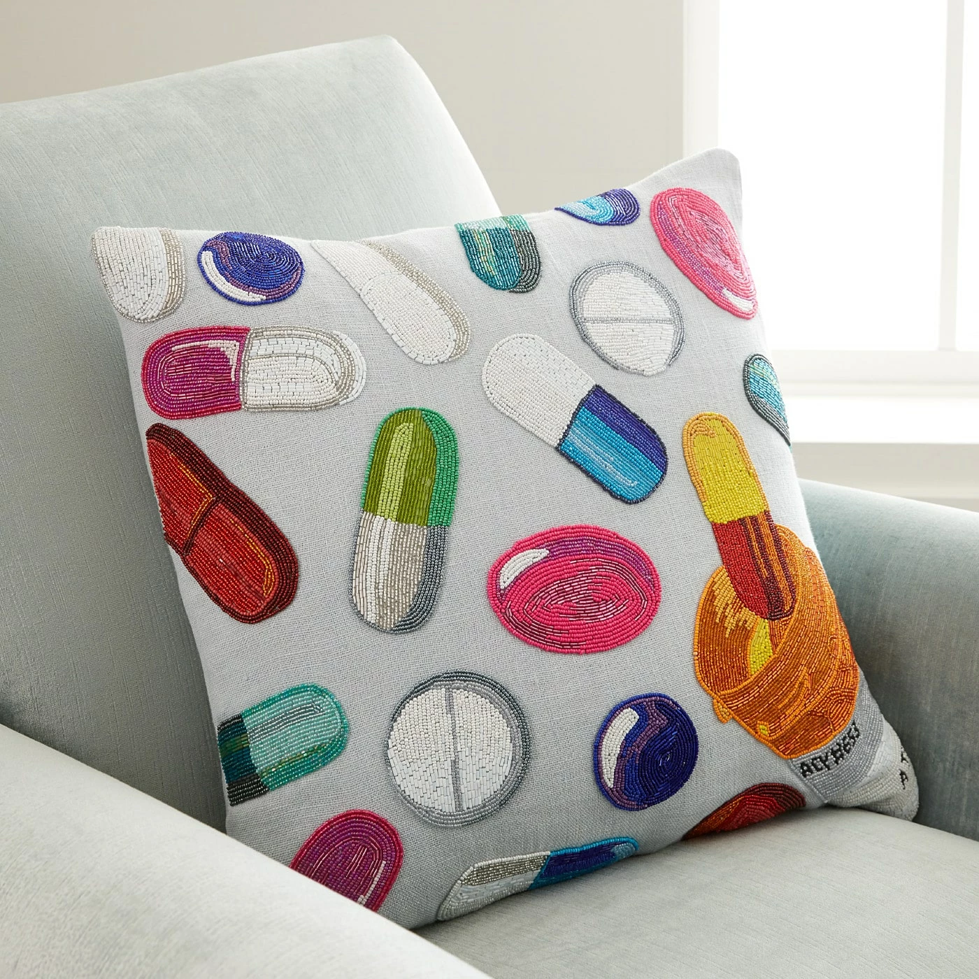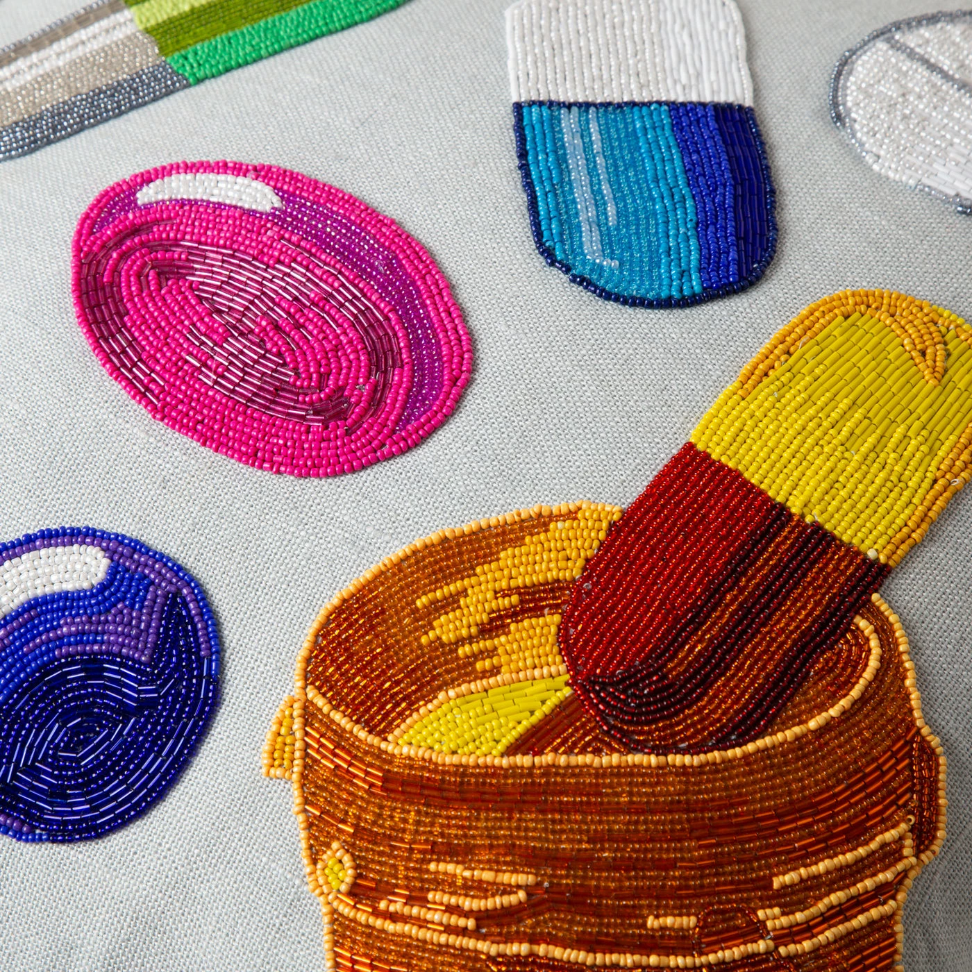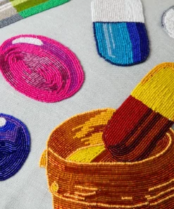 We collaborated with an artisanal workshop in India where a master beader imbued our clean graphic designs with craftsmanship and soul. Each artwork is hand-beaded on linen ground. Beads of varying heights and patterns within patterns create a sense of depth and dimension. The result is part pop art, part textile triumph.