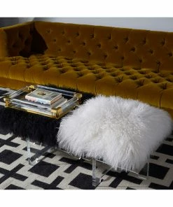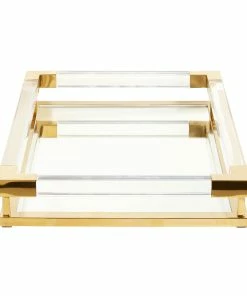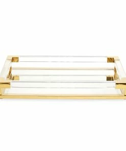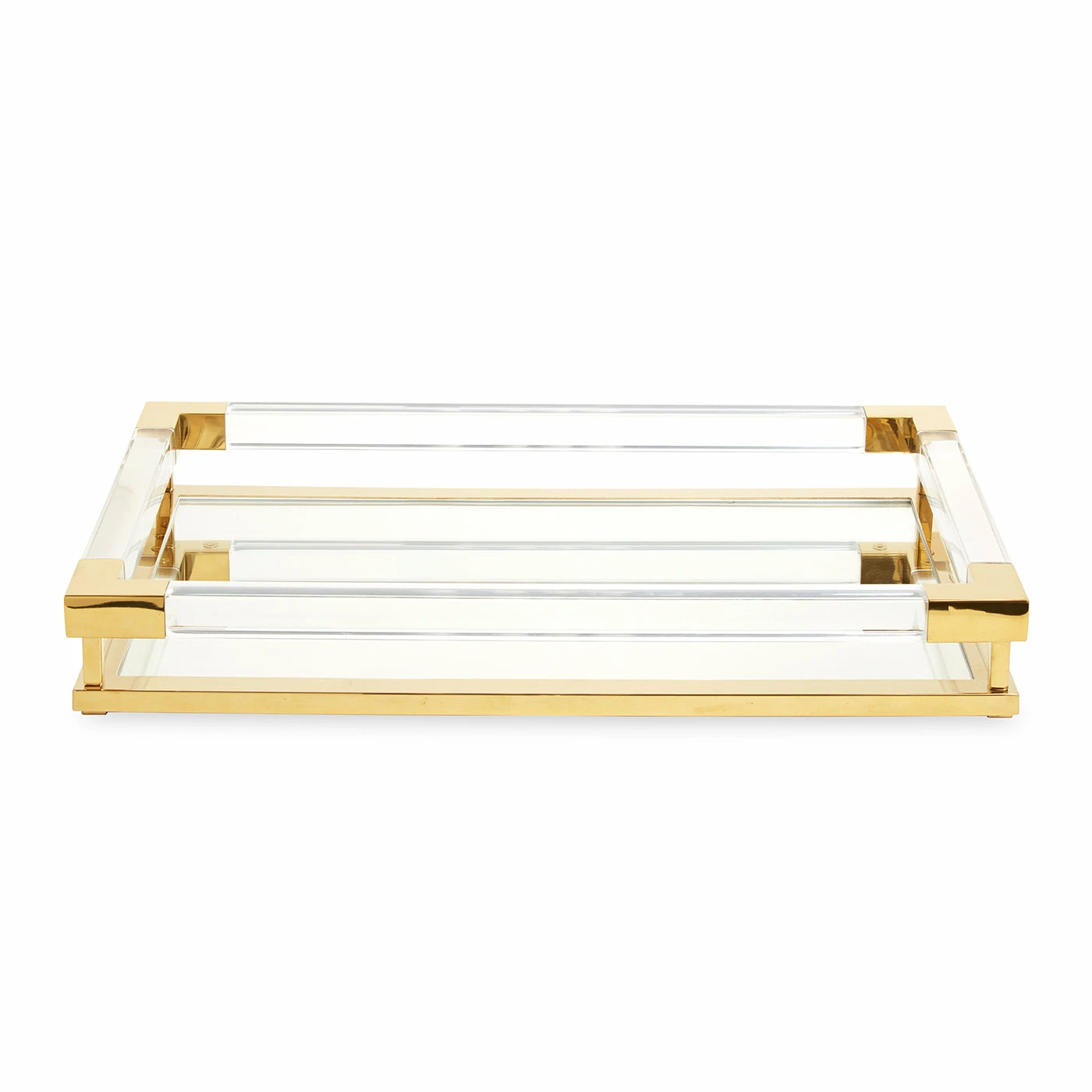Corral your prized possessions without crowding your space. In luxe acrylic with polished metal accents, our Jacques Tray is sized to befit a well-stocked bar, and is the perfect accessory for a generous ottoman or cocktail table. Available in luxe clear acrylic with polished brass accents or in smoke acrylic with polished nickel trimmings.