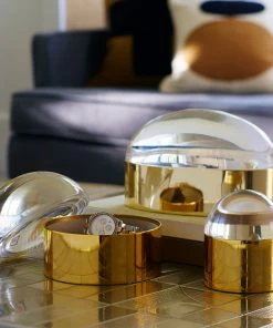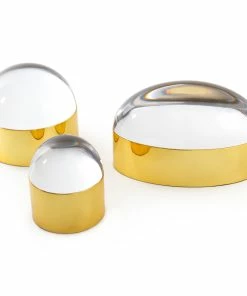 Float into our world of dreamy orbs and cabochons. Its polished brass base topped with a luminous clear or jewel toned acrylic lid, our Globo Box imparts high-voltage glamour on any tabletop, powder room counter, or cocktail table. Glowing gems on their own and even more intriguing when styled together. Available in three sizes.