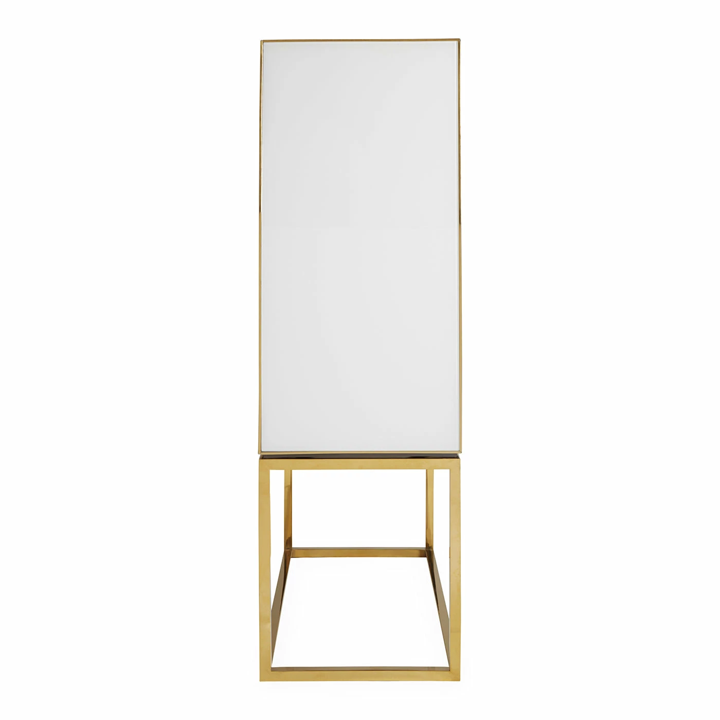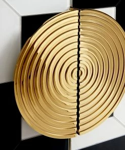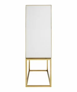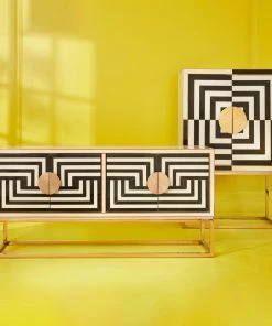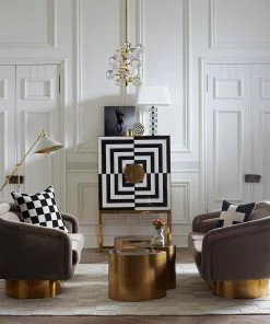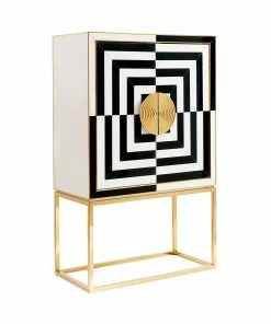 A limited-quantity edition, our modernist and mind-bending cabinet features glass panes back painted in charcoal and ivory with polished brass details. Grooved, split-circle door pulls add a glam spin. Fitted with adjustable tempered glass shelves, plus six wire-bound drinking glass shelves inside the doors. Two drawers at the base keep your mixing accoutrements at hand.