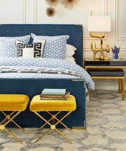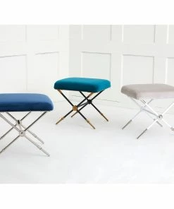 An updated take on Empire style, our Rider X-Bench doubles as a tiny table when topped with one of our trays. The generous seat is covered in velvet atop a sparkling, sabot-detailed nickel or brass frame.