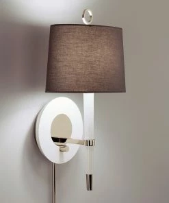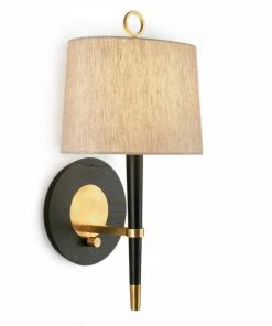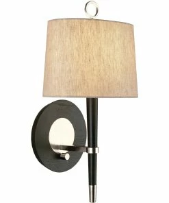 Our Ventana Sconce is elegant and ladylike in ivory wood with polished nickel accents or timelessly handsome in ebonized wood with antiqued brass or polished nickel accents. Topped with a natural linen shade.