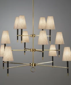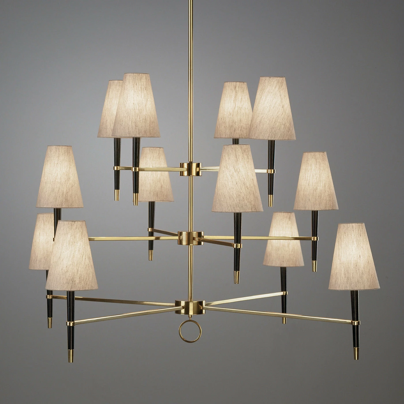 Our Ventana Three-Tier Chandelier is elegant and ladylike in ivory wood with polished nickel accents or timelessly handsome in ebonized wood with antiqued brass or polished nickel accents. Topped with natural linen shades.