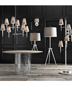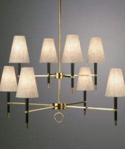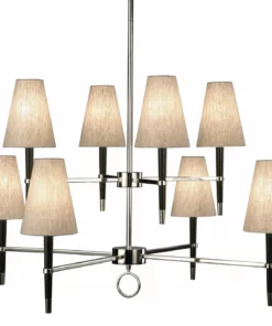 Our Ventana Two-Tier Chandelier is elegant and ladylike in ivory wood with polished nickel accents or timelessly handsome in ebonized wood with antiqued brass or polished nickel accents. Topped with natural linen shades.