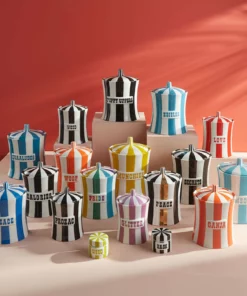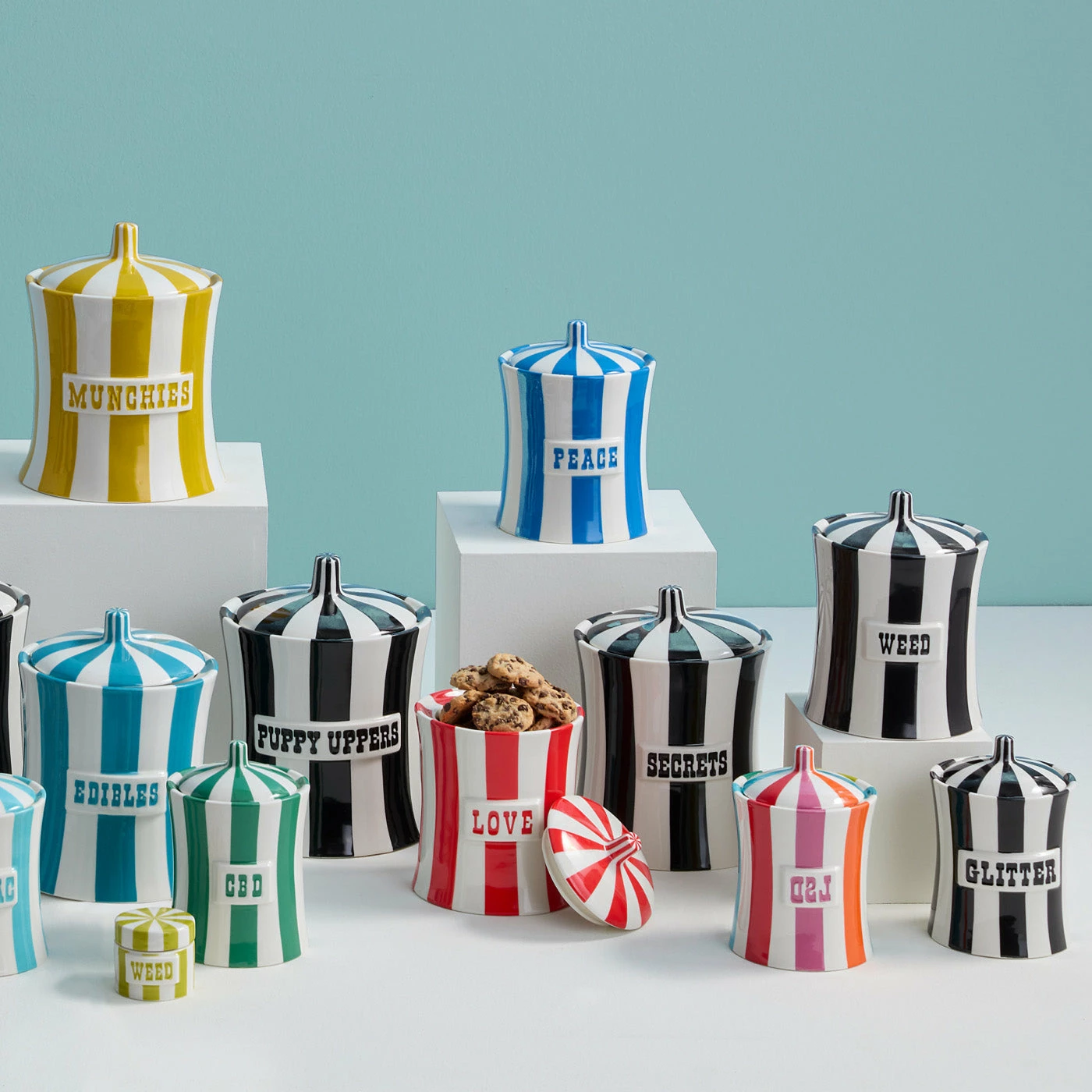 Celebrate life’s little helpers. Our iconic canisters show off your indulgences, from sweets to sedatives, in irresistible hues: each high-fired porcelain canister is hand-painted with a graphic black and white or rich color finish. Cluster a few on your counter, keep one bedside for late-night cravings, or go wild and collect them all.
