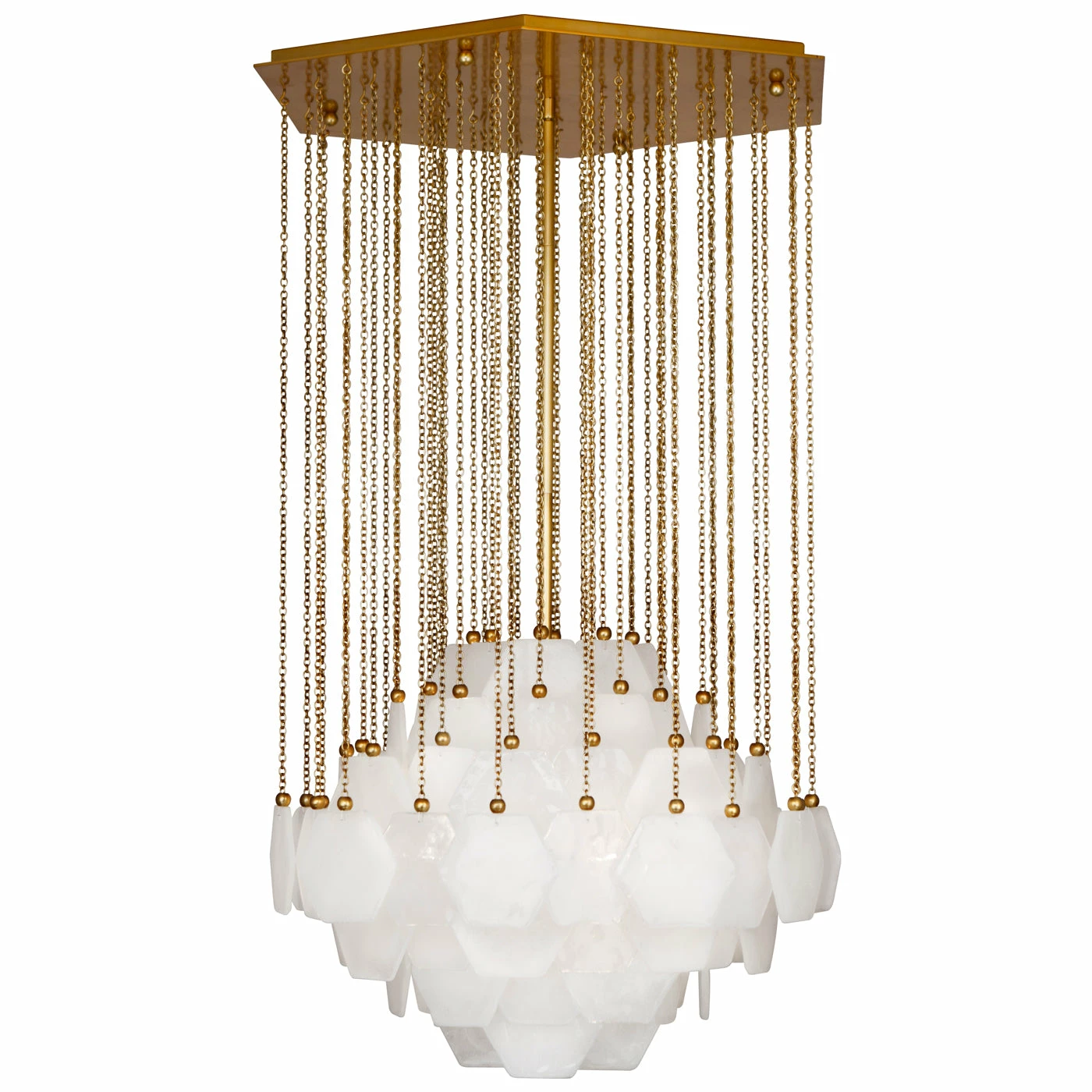 Eighty-eight pieces of hexagonal Pulegoso* glass pieces hang from a brass ceiling plate by chains in a diamond composition. The expertly handcrafted, nearly opaque Pulegoso* glass adds a glamorous glow to any room. Our Vienna Large Chandelier makes a chic statement in the center of a living room or illuminating a grand boudoir.