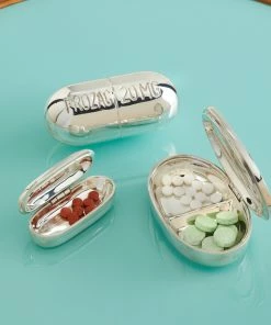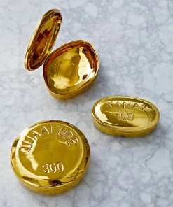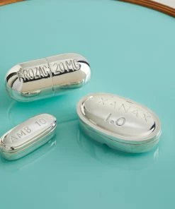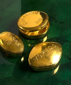 We’ve taken our longtime love of pharmaceuticals to a new level of luxe: cast in solid brass, our hinged pill boxes are just what the decorator ordered—a dose of glamour in warm hand-polished brass or a pop of jewel-like sparkle in shining silver plating. Each box top is laser-etched with an mg presciption. The perfect provocative touch for your tablescape or hip hideaway on your bedside table.
